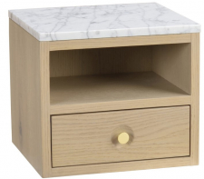 | Materiał: | prowadnice szuflad z metalu i blat z białego marmuru. , wnętrze szuflady z drewna liściastego , Wykonane z forniru dębowego na MDF. Front szuflady z litego dębu |
