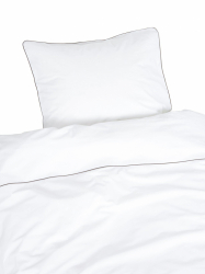 Poszwa na kołdrę w dużym rozmiarze zamykana jest wygodnie na guziki u dołu, co zapewnia bezpieczne dopasowanie, podczas gdy dwa dołączone poszewki na poduszki mają praktyczne otwarcie kopertowe, co ułatwia wymianę. Stylowe detale, takie jak nougatowy pasek wzdłuż wszystkich czterech stron poszewki na poduszkę i wzdłuż górnej szerokości poszwy na kołdrę, nadają elegancki akcent, który podnosi pościel na nowy poziom.